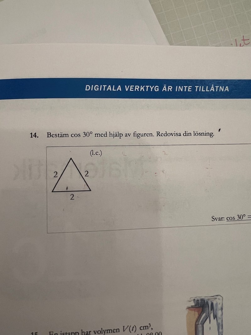 cos v = närliggande katet/hypotenusa, i det här fallet facits svar.