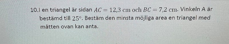 Triangeln är bestämd, bortsett från att B kan vara spetsig eller trubbig. Bestäm B med sinussatsen. Du får två möjliga värden. Välj det som ger minsta arean. Använd areasatsen.