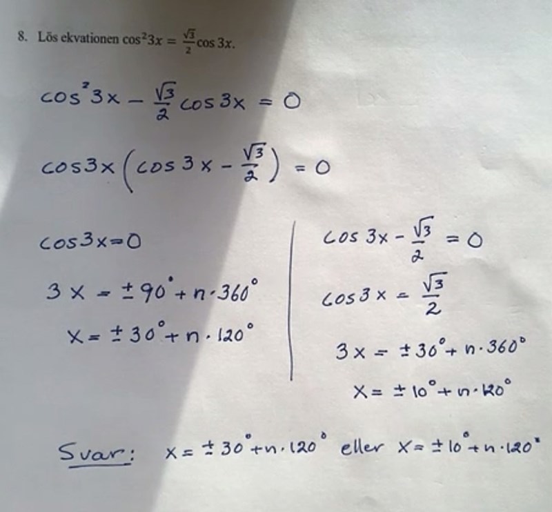Jag beräknade genom att dividera bort cos3x från HL och VL. Jag förstår utifrån bilden att man inte får göra så för att man då ”tar bort” en lösning, men jag förstår inte riktigt varför den försvinner med min metod eller hur man ska veta det i förhand.