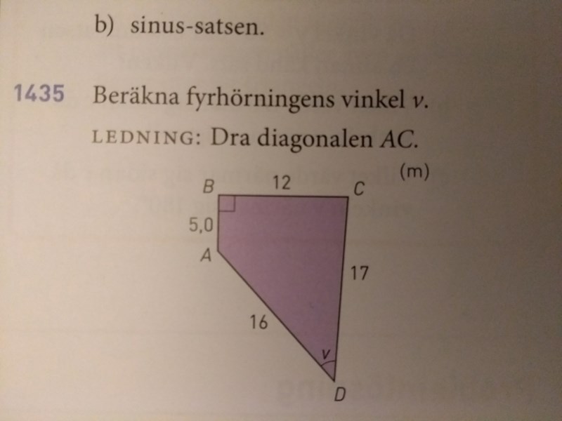 Jag har fastnat på denna fråga, om man drar diagonalen AC så blir AC hypotenusan för den ena triangeln och något annat för den andra. Vad ska man göra då? Jag tänkte att man först tar reda på längden på AC så att man sedan kan använda sig av cosinus-satsen för att lösa uppgiften.