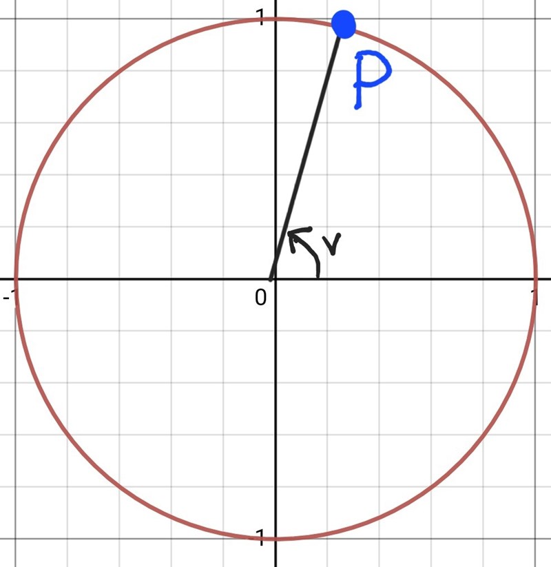 Eftersom en punkt på enhetscirkeln har koordinaterna (cos(v), sin(v)) så är ekvationen tan(v) = 4 uppfylld för alla punkter där den vertikala koordinaten är 4 gånger så stor som den horisontella koordinaten.