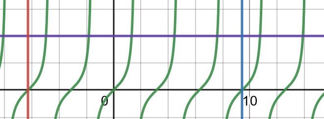 Ett alternativt sätt att tänka är att tan(v) är en monoton funktion på intervallet (-π2,π2) och har en period på pi, dvs den upprepar sig. Därmed finns det exakt 1 lösning per intervall (πn+π2, πn+3π2) för något heltal n.