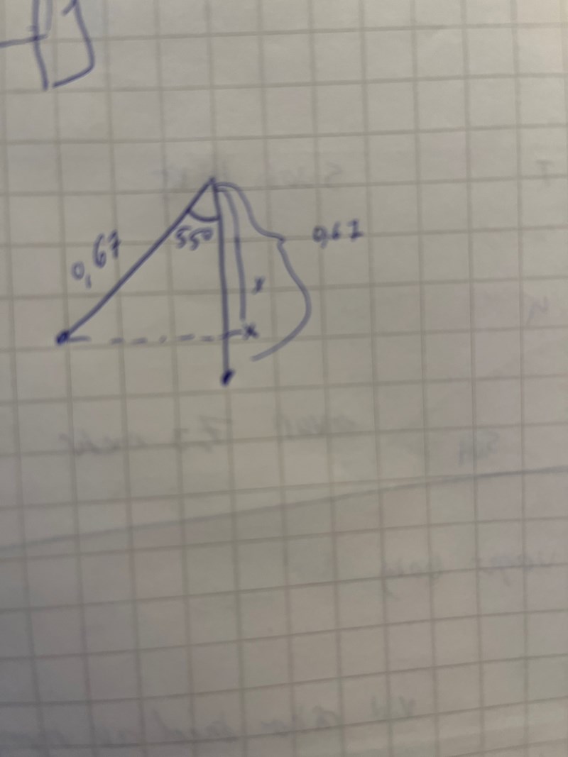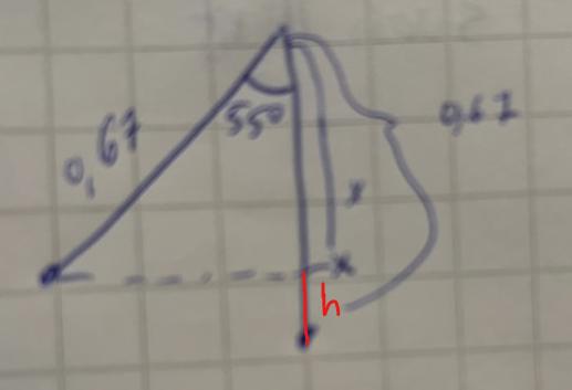 genom att ta cosinus eller sinus eller? och ta reda på x först genom det. Sedan tar man 0.67-x för att ta reda på H. Problemet är att jag blandar ihop cosinus med sinus och det