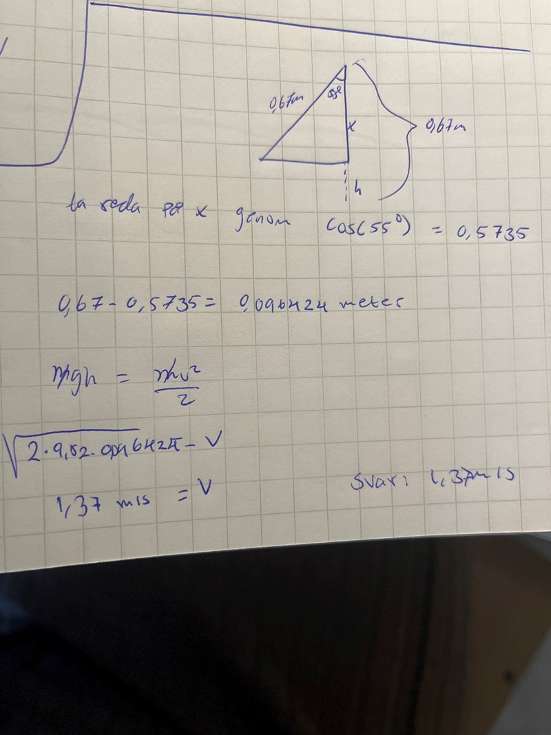 det blir alltså 1.3 meter/sekund. Men hur blir det längre? Jag har fått sveret men förstår inte riktigt än. Eller jo jag kanske förstår. Att man först tar 0.67+ h för lägesenergin och sedan tar minus 0.67 för att räkna höjden i skillnad. Eller mg(h0-h1) Tänker jag rätt nu?