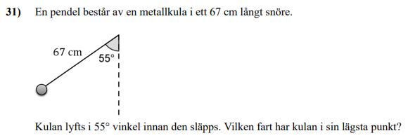 Det är här vi ska utnyttja att energin bevaras. I ursprungsläget har kulan lägesenergi, men ingen rörelseenergi (vi släpper den från stillastående). Vad har kulan för sorters energi i det understa läget?