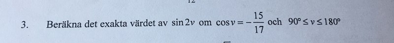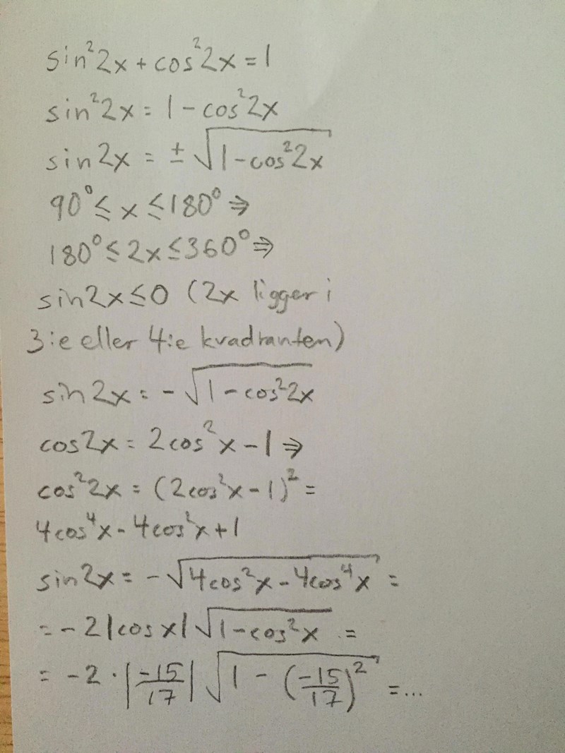 Teraeagle skrev:Med hjälp av efter att du har bestämt värdet på . Kan du utnyttja trigonometriska ettan och enhetscirkeln för att bestämma det värdet?