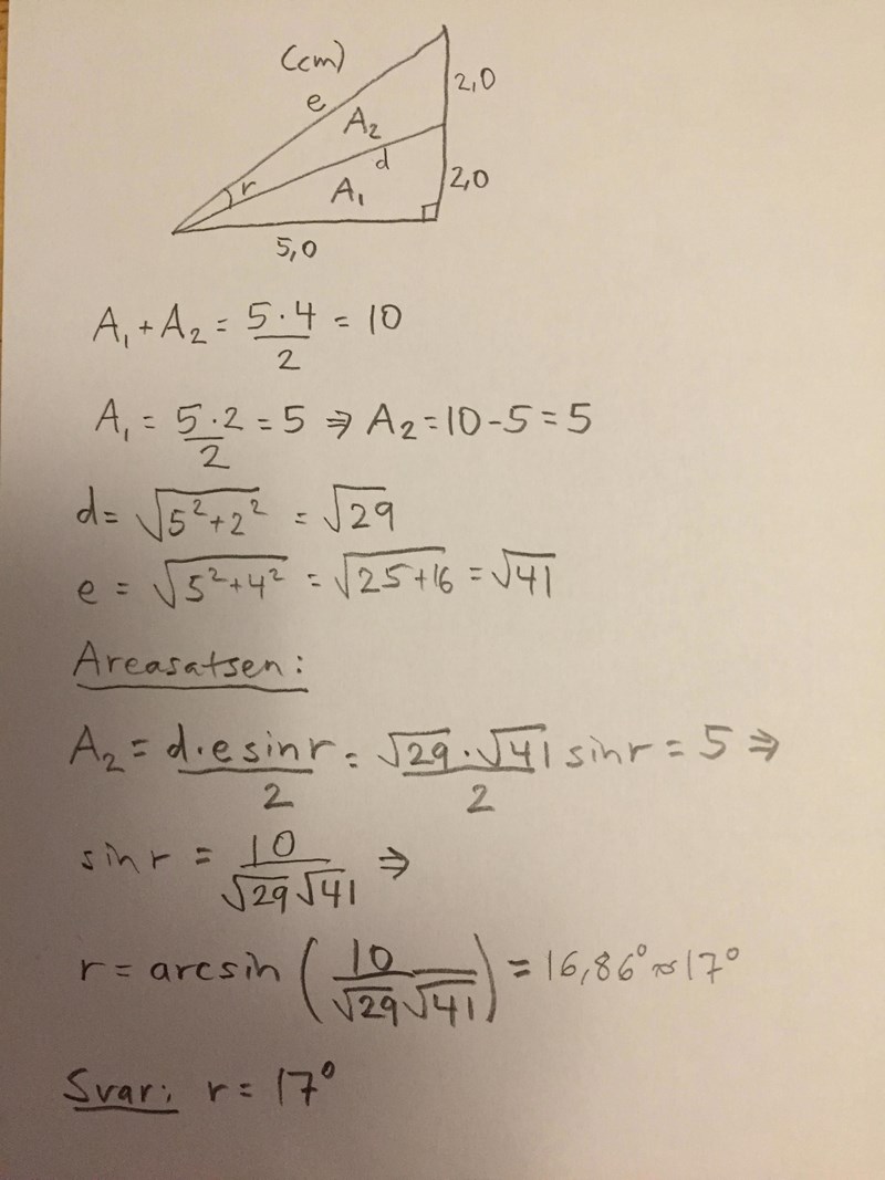 Rolig uppgift! Går att lösa på flera olika sätt. Smutstvätts förslag på lösning är nog den elgantaste, men går även att lösa med areasatsen enligt föregående inlägg.