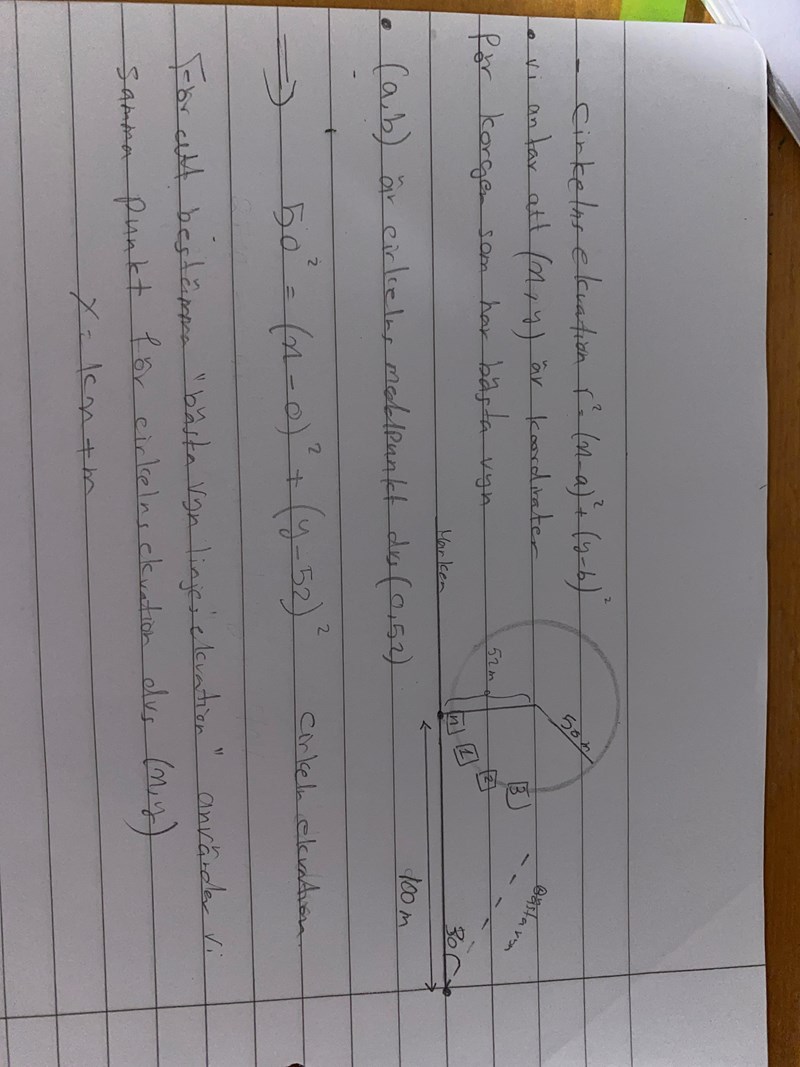 Jag fick linjens lutning på - tan 30, om det är rätt så måste jag fortsätta med att beräkna m-värde i linjens ekvation. Ska jag lösa uppgiften genom att hitta skärningspunkten mellan cirkelns ekavtion och linjens ekvation?