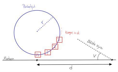 Avståndet d=100 m, pariserhjulets radie r=50 meter, pariserhjulets medelpunkt ligger 52 m över marken, och vinkeln v=30 grader.