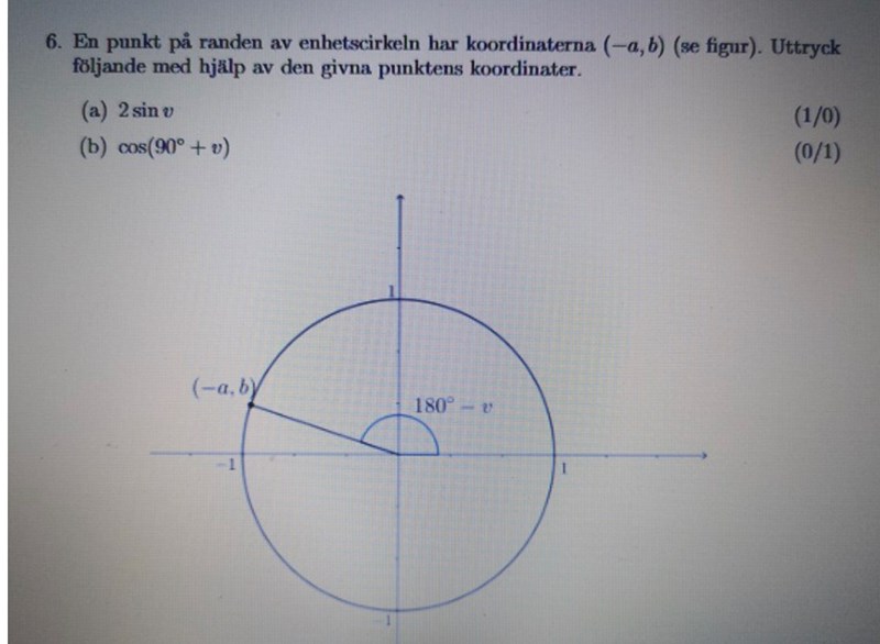 Ebbask skrev:Freewheeling skrev:Bilden säger oss att cos(180-v) = -a. Sen kan du utnyttja att cos(180-v) = -cos(v) samt att cos(90 + v) = -cos(v).