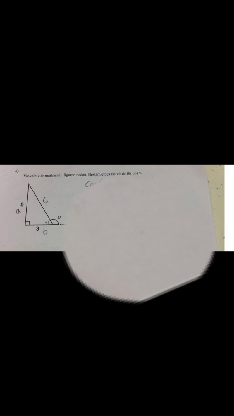 Precis, som sagt, du har ett exakt svar men jag tror inte att det är det enklaste svaret, vi hade som sagt otur med vinkeln. Vi får nog vara mer kreativa än så om vi vill ha ett finare svar. Vi kanske får utöka triangeln som innehåller vinkeln V och beräkna sidorna så att vi kan få något i stilen cosv = något/annat. Jag tror inte vi kan förenkla svaret vi har fått på något enkelt vis, jag ska fundera på det.
