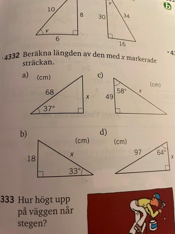 Tack! Jag lyckades lösa d). Däremot får jag fel svar på b). Jag får x=18 medan facit säger 33