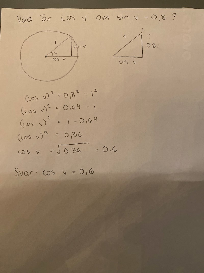 Jag har stött på en fråga som lyder: vad är cos v om sin v=0,8?