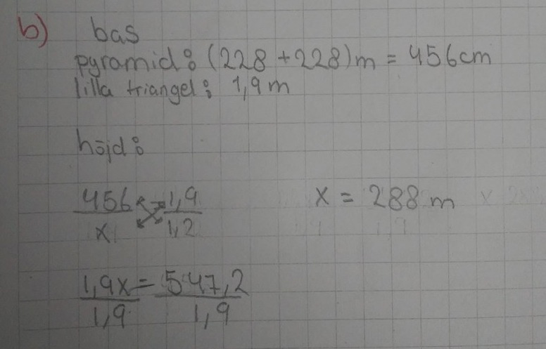 Men det står ju att hälften av basen är 228 m och bör då inte hela basen va då 228*2 som är 456.