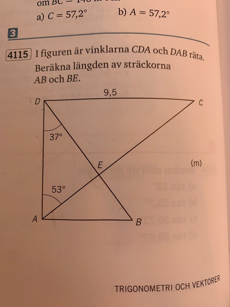 I figuren är vinklarna CDA och DAB räta. Beräkna längden av sträckorna AB och BE.