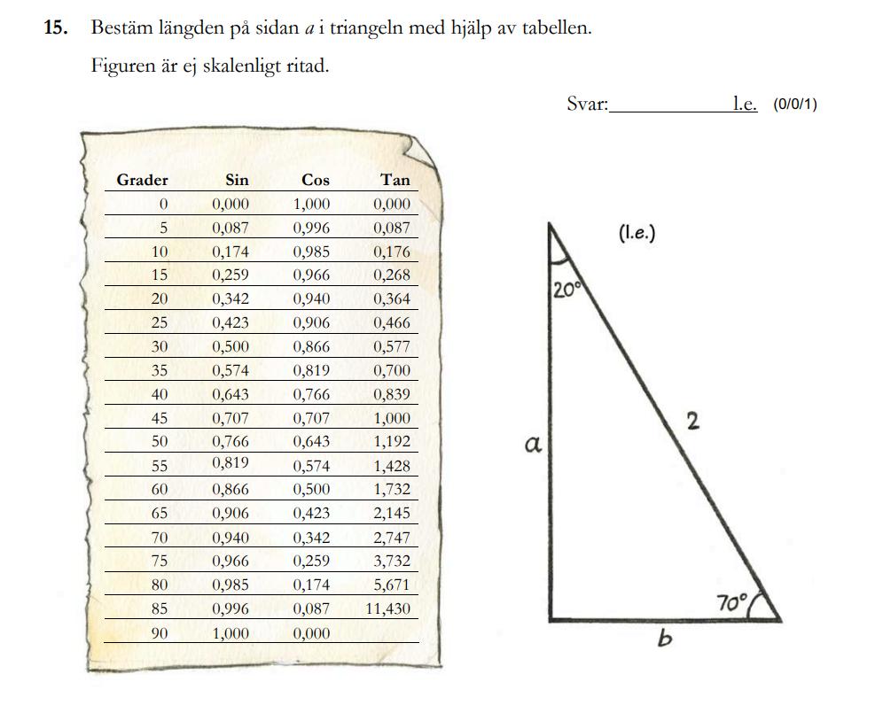 Jag behöver hjälp med den här frågan (digitala verktyg är inte tillåtna). Har försökt lösa den men har fått fel svar varje gång. Vet inte hur jag ska använda tabellen heller.