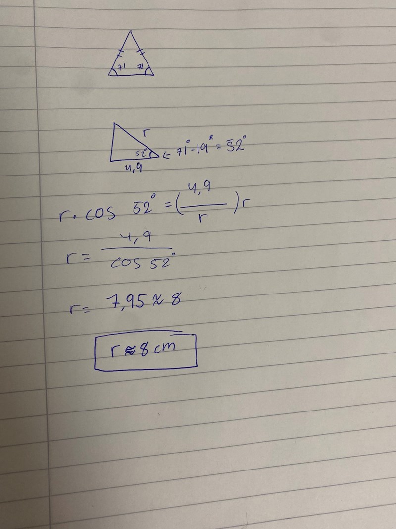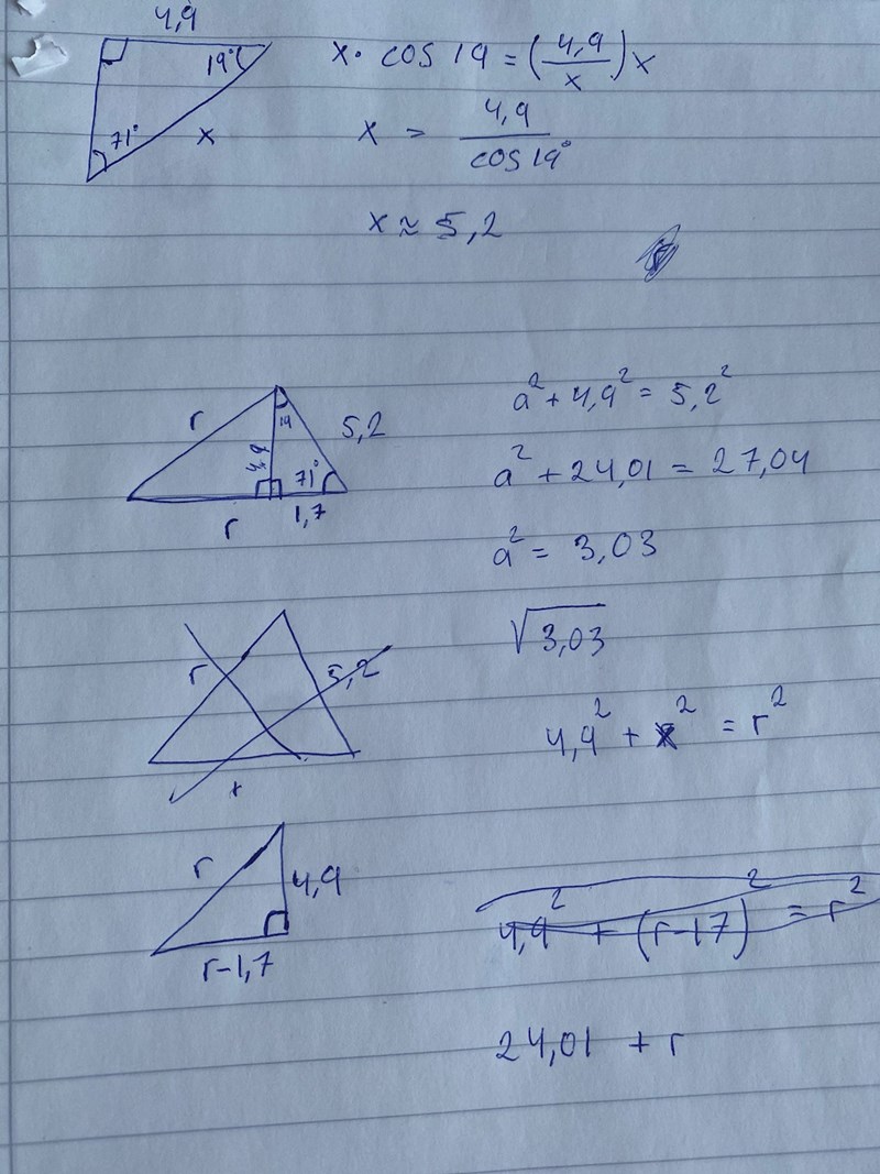 nu kan du bestämma y och sen mha cosinus och vinkeln bestämma radien.