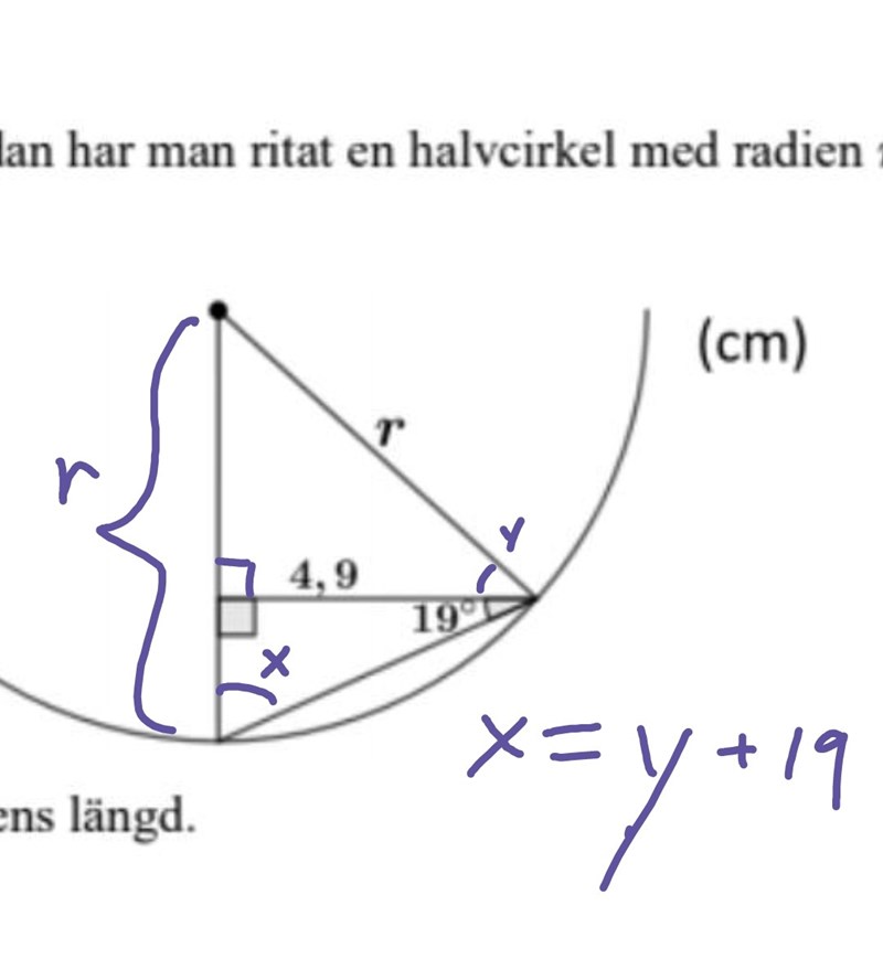 Den stora triangeln ör ju likbent, två ben med längd = radien r går ut från centrum av cirkeln. Som Micimacko skriver blir x=y+19.
