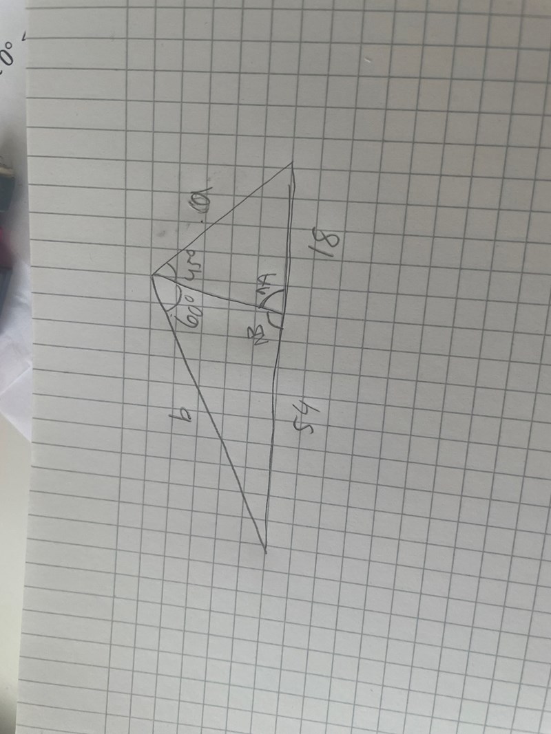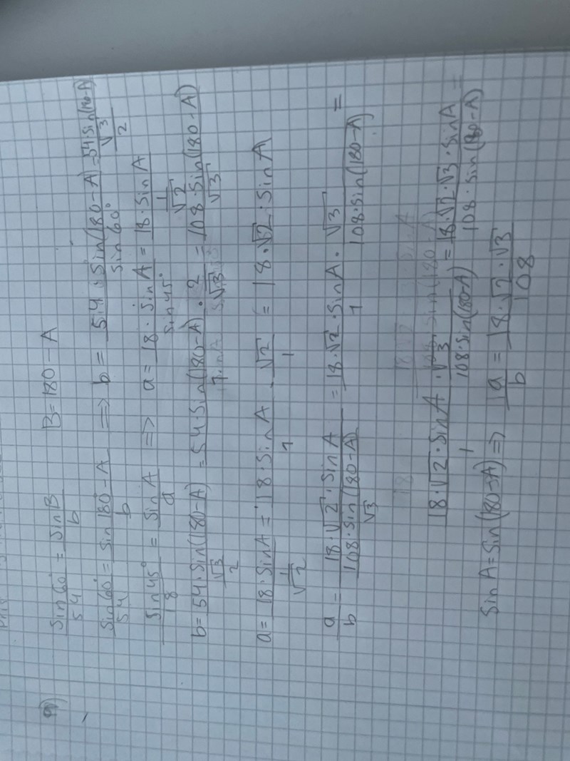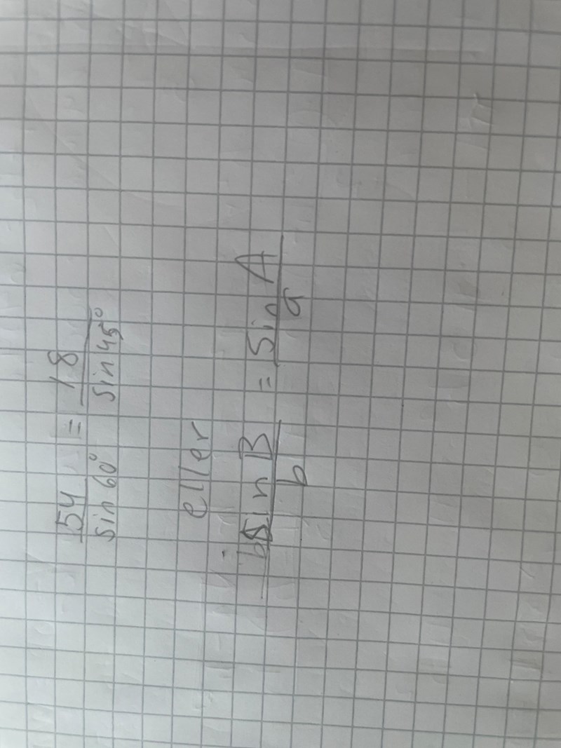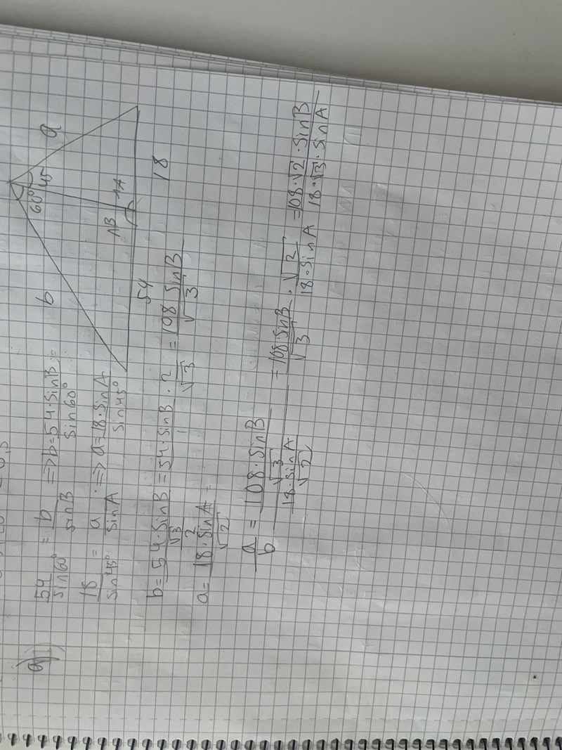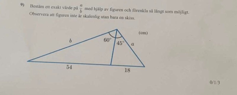 Nej inte riktigt 54/sin60=b/sinB och 18/sin45=a/sinA lös ut a och b och ställ upp kvoten a/b