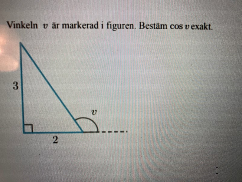 Jag använde cosinussatsen för att få ett uttryck för cos w. (180-v). Hypotenusan är roten av 13. Och fick då att cos w = 4/roten ur 13
