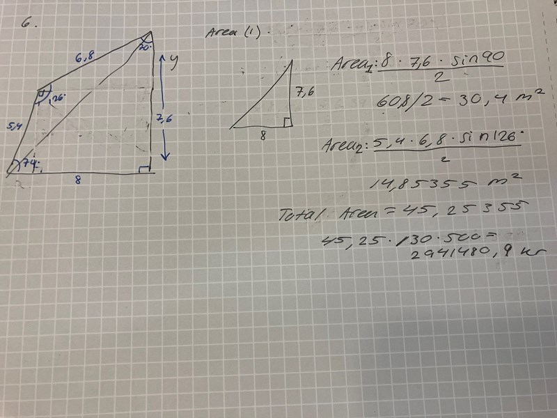 I facit står det att det blir 150 000 kr och jag får 2941480. Räknat ut arean för båda trianglarna och sen omvandlat oså. Jag fattar inte vart det blir fel någonstans?
