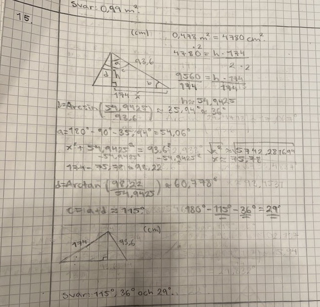 Jag bifogar min lösning nedan som gav svaret 115 grader, 36 grader och 29 grader. Jag ber om ursäkt för att lösningen är ganska rörig och otydlig, men jag hoppas ändå att det kan vara till hjälp! :) Jag började helt enkelt med att använda arean och en av sidorna i triangeln för att beräkna höjden. Med hjälp av detta kunde jag sedan räkna ut vinklarna genom att använda mig de rätvinkliga trianglarna som bildades inom triangeln.