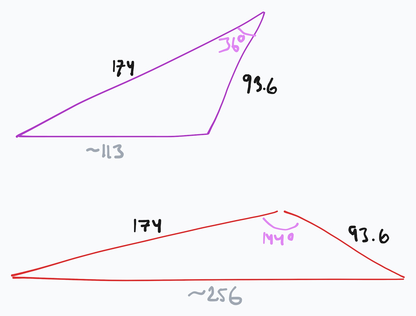 Men kommer den andra lösningen till triangeln se ut så som jag tänkte? Alltså att ingen av de givna sidorna utgör basen av triangeln? För visst skulle triangeln annars få samma vinkar som den första lösningen, även om man byter plats på 174 cm och 93,6 cm?