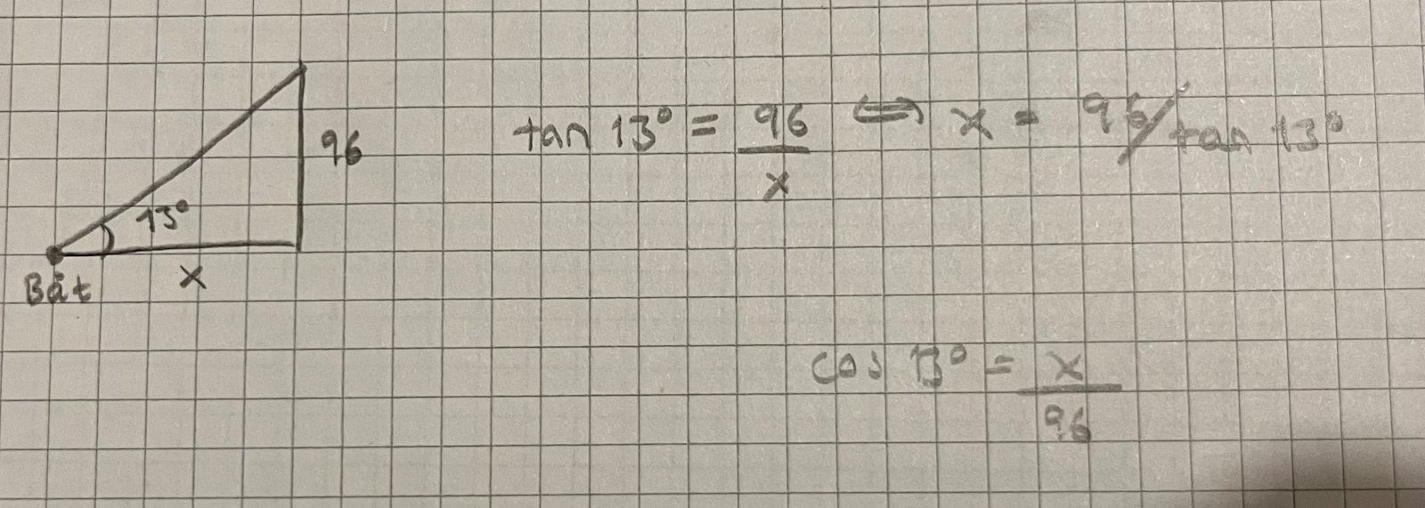 Så som jag tolkar uppgiften så är min övre uträkning den korrekta. Men, enligt facit är svaret cos 13 * 96, vilket skulle tyda på att min nedre uträkning är korrekt. Men då är alltså x hypotenusan, vilket känns helt fel? Är det facit som spökar, eller jag som tänker/tolkar fel?