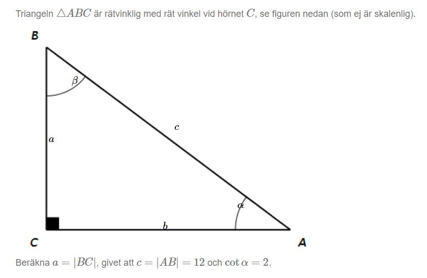 Hej! Har fastnat på denna uppgift och uppgifter liknande denna. Här tänker jag att cot alpha=2 är samma som 1/tan(alpha)=2. Vilket borde betyda att Tan (alpha) bör vara 0.5 då 1/0.5=2. Eftersom tan är motstående katet/närliggande katet motsvarar det här a/b. a/b borde alltså vara 0.5, tänker därmed att jag skall ha något dubbelt så stor i nämnaren som täljaren och ersätter då a/b med x/2x. Jag har nu a=x b=2x och c=12. Här valde jag att använda mig utav pythagoras sats och kommer då fram till att x=4. Och 2x därmed 8. Alltså a=4, b=8, c=12. När jag fyller i a=4 får jag dock fel. Förstår inte vad jag gjort fel. Tacksam för hjälp!