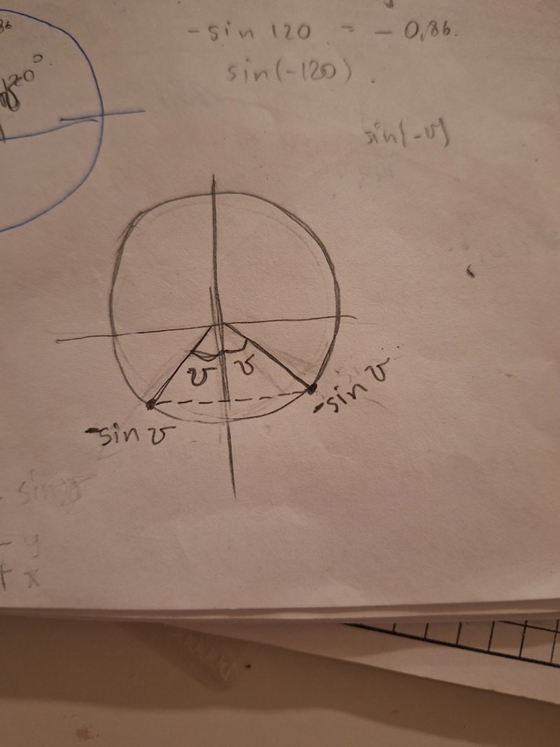 Hela klassen har fastnat på en fråga som handlar om enhetscirkeln. Frågan är att man ska visa med hjälp av enhetscirkeln att: -sin v=sin(-v). Vi vet redan att det är sant och bestämmer men vet inte hur ska man bevisa. Jag har ritat upp en bild. Kan någon förklara? Tack