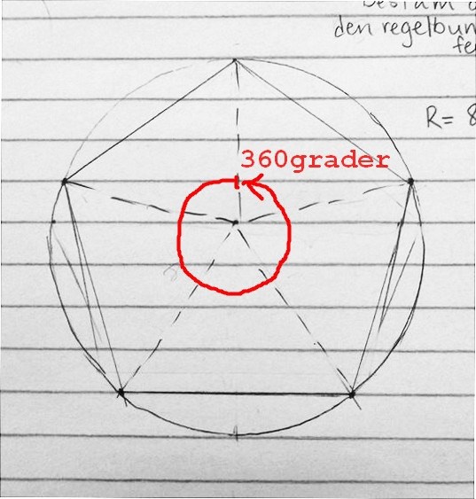 Cirkelns radie är 8,0 cm och den är en regelbundna femhörning. Bestäm arean av den femhörningen.