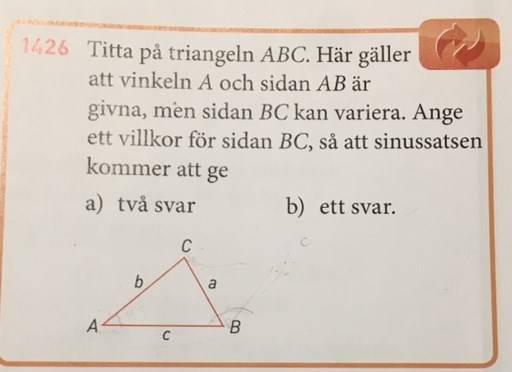 Jag vet hur man räknar på trianglar som har 2 olika lösningar men får just inte ihop den här uppgiften. Hjälp skulle uppskattas!