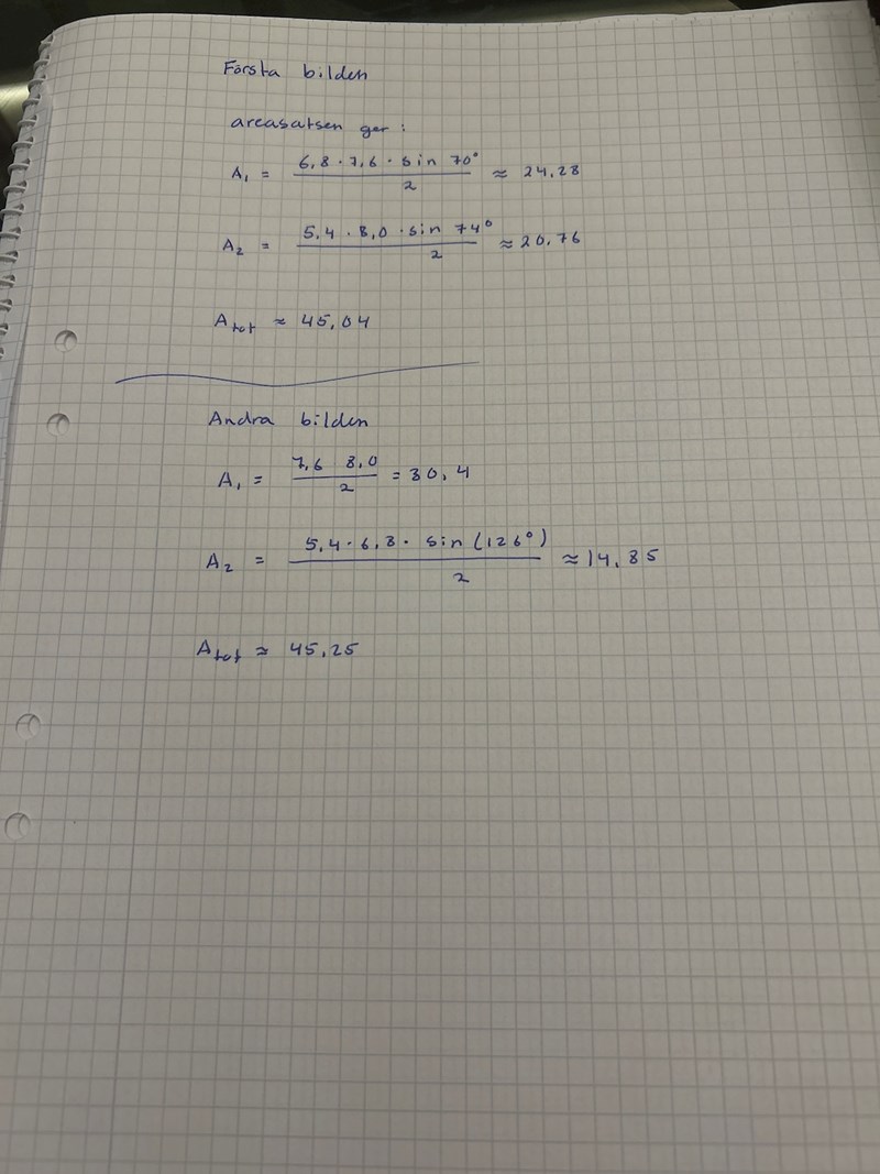 På den första får jag den totala arean till 45,044 medan jag får den till 45,25 i den andra. Hur kan det bli så?
