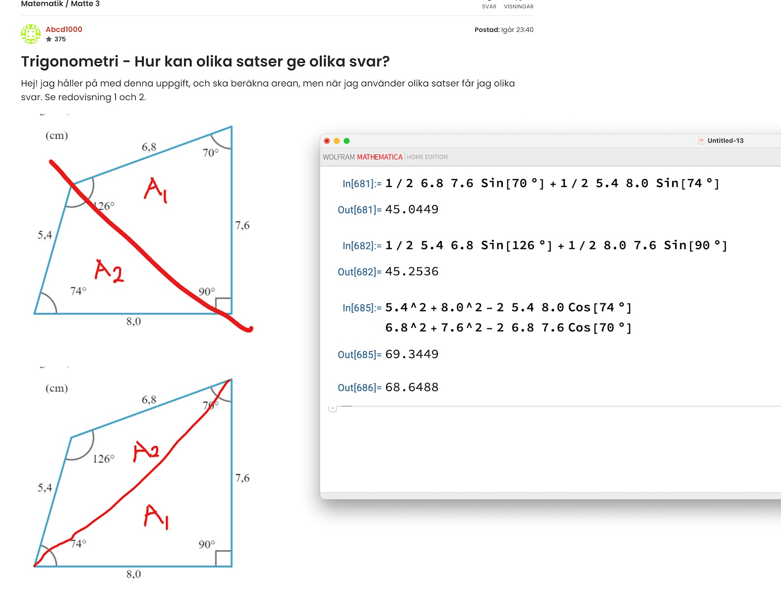 Abcd1000 skrev:Hej! jag håller på med denna uppgift, och ska beräkna arean, men när jag använder olika satser får jag olika svar. Se redovisning 1 och 2.