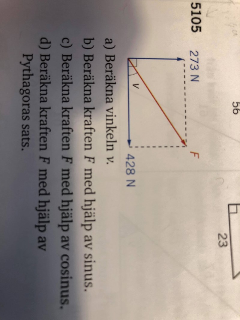 Du har en rätvinklig triangel där du vet hur långa båda kateterna är. Då kan du räkna ut vinkeln v med hjälp av tangens!