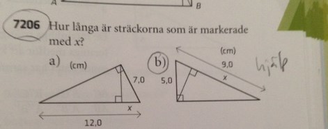 Du har en liten triangel där korta kateten är x och hypotenusan 7.