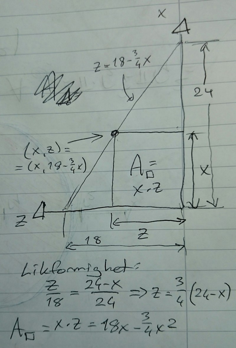Det som är intressant och orsaken till att du ändå fick fram rätt svar är det faktum att likformigheten och därmed uttrycket 18x - 0,75x^2 för rektangelns area gäller även för en rätvinklig triangel med bas 18 och höjd 24.