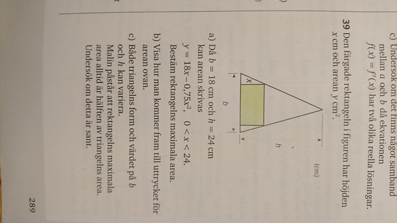 a) då b=18 cm och h=24cm kan area skrivas . Beräkna rektangels maximala area.