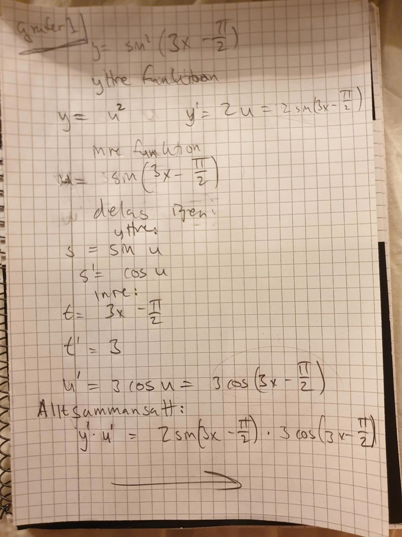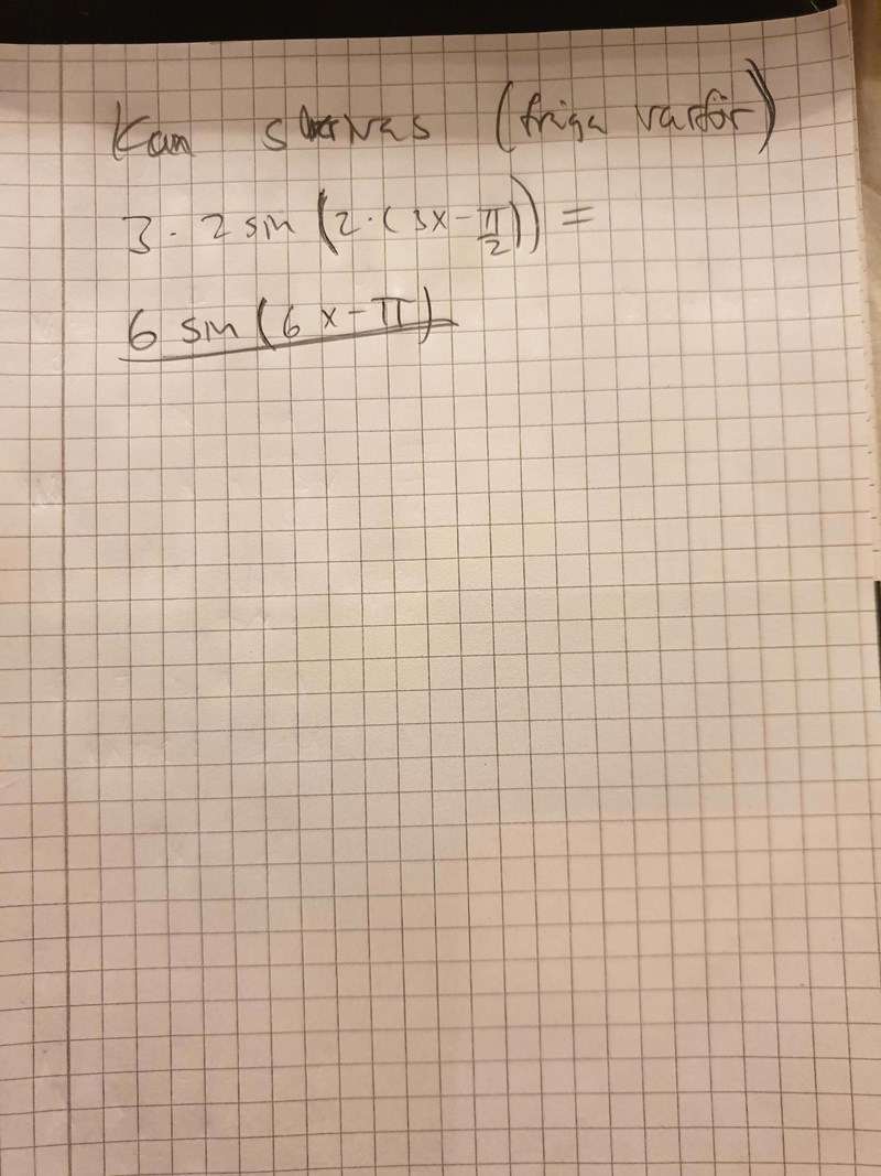 Är svaret helt korrekt? Vi har en sexa på utsidan. Borde då inte vårat (v) multipliceras med 6 alltså 6*(3x-pi/2) så att det blir sin(18x-3pi) som är svaret?