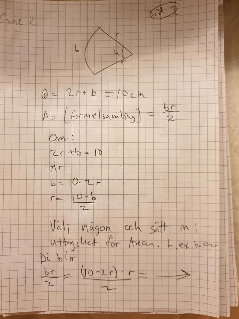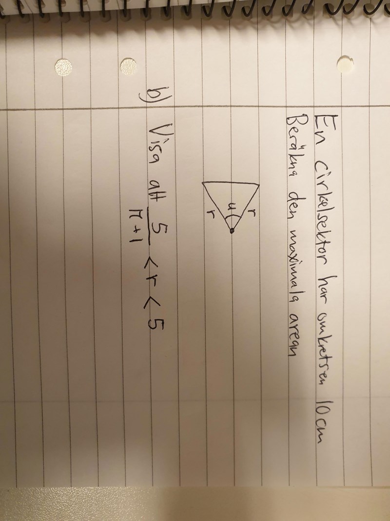 Tips: Omkretsen består av två radier och en båglängd. Det ger dig ett samband mellan radien och öppningsvinkeln. Teckna ett uttryck för arean ned hjälp av detta. Maximera uttrycket för arean.