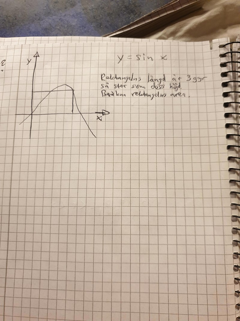 Det gäller att x = 3y = 3sin(x) och att arean A = x*y = x*sin(x).