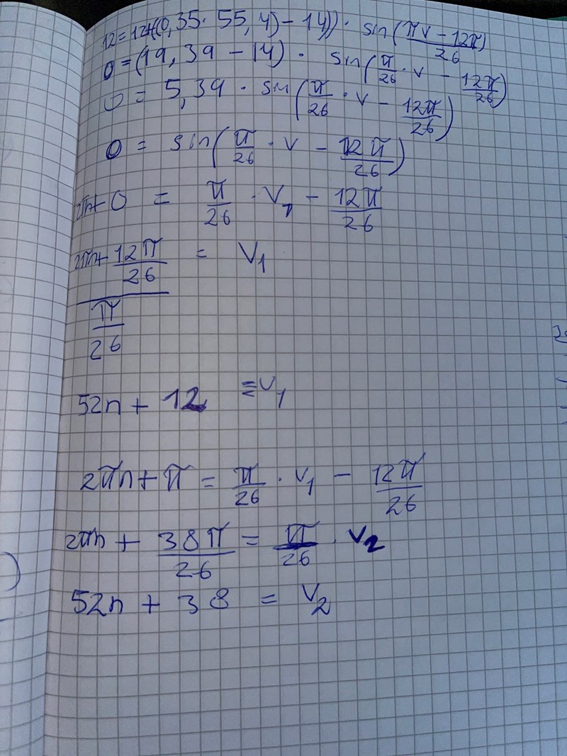 B=55.4 och jag löser ut v. Är det rätt tänkt? När jag löser ut v kommer jag även få en periodicitet med. Då måste jag tänka på att ett år har maximalt 54 veckor . Alltså kan antalet vecko nummer inte överstiga 54 . Tänker jag i rätt banor?