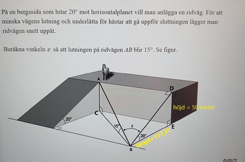 Beräkna vinkeln x så att lutningen på ridvägen AB blir 15 grader.