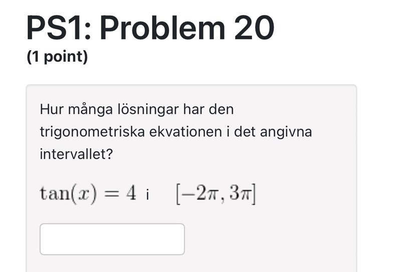 Som jag skrev tidigare så är funktionen bijektiv (injektiv och surjektiv) på varje repetition. Detta innebär att ekvationen tan(x)=4 har precis 1 lösning för varje repetition. Då återstår det bara att avgöra hur många repetitioner det finns inom det eftersökta intervallet.