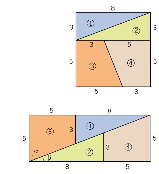 Förklara var den extra kvadratcentimetern kommer ifrån genom att beräkna vinklarna α och β i figuren.