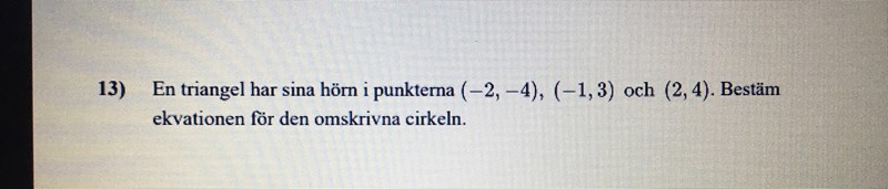 Jag skulle ta reda på var mittpunkten för de tre sidorna är, konstruera funktionerna för de tre normalerna och beräkna var de skär varandra (det borde räcka att använda sig av två av dem). Då får jag fram koordinaterna för cirkelns mittpunkt. Sedan skulle jag använda avståndsformeln för att beräkna cirkelns radie och därefter kan jag svara på frågan.