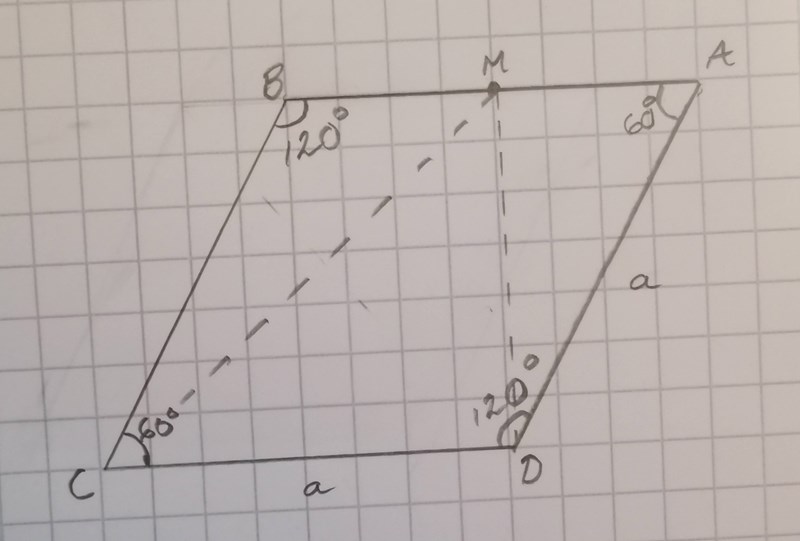 Romben ABCD har sidlängd a och vinkel 60◦ vid hörnet A. Om M är