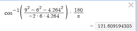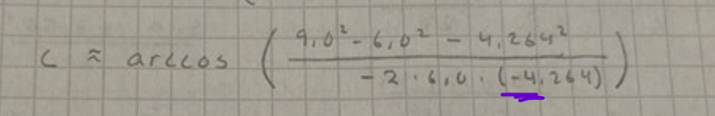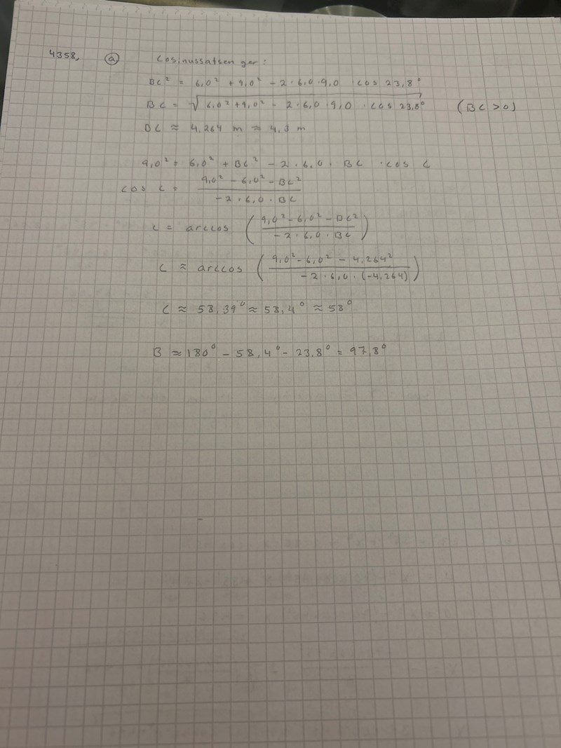Hej! Jag skulle behöva få hjälp med denna uppgift. Jag använder cosinussatsen för att räkna ut sträckan BC och får den till 4,3 m, vilket stämmer. Men när jag sedan försöker använda cosinussatsen för att beräkna vinkeln C får jag den till 58 grader, vilket inte stämmer. varför får jag fel?