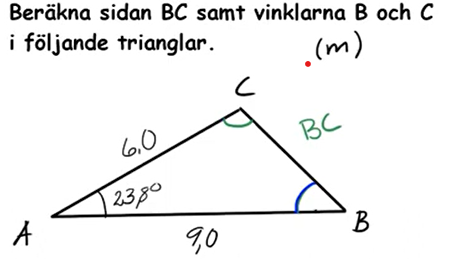 Ja, det stämmer faktiskt. Jag har inte gjort sådana här frågor på en rätt lång tid. Min intuitiva gissning är att, eftersom vi kommer få två par lösningar för BB och CC, finns bara en av dem som adderar upp till rätt vinkelsumma. Men sinussatsen är en bra metod bara att verifiera att din lösning stämmer, du behöver inte nödvändigtvis lösa allt på nytt. Det räcker att kolla om