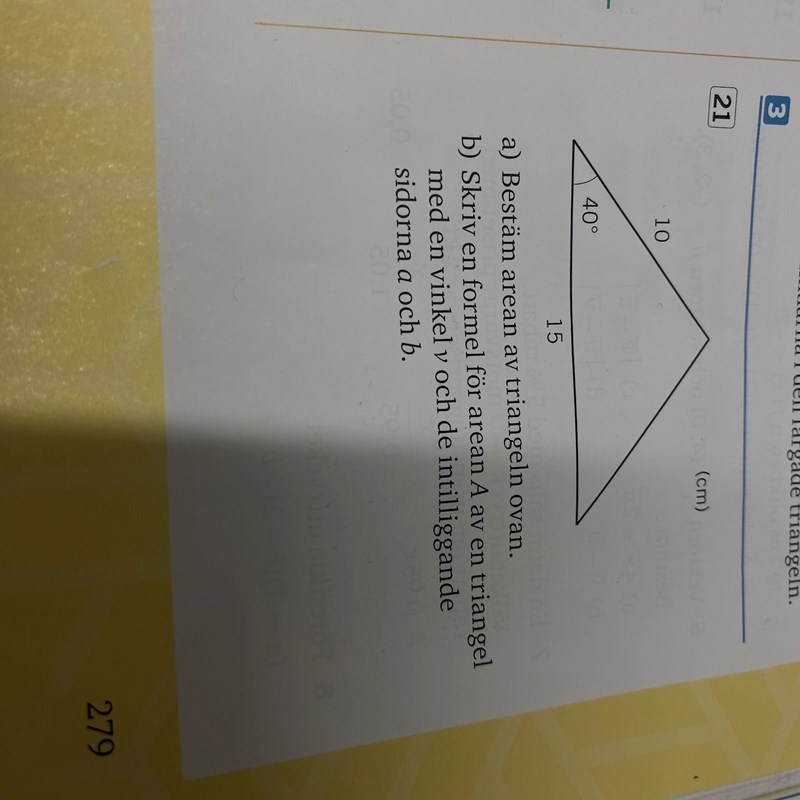 Det finns en generell areaformel för trianglar som säger att arean är lika med där är vinkeln mellan och . Kan du använda den på något sätt?